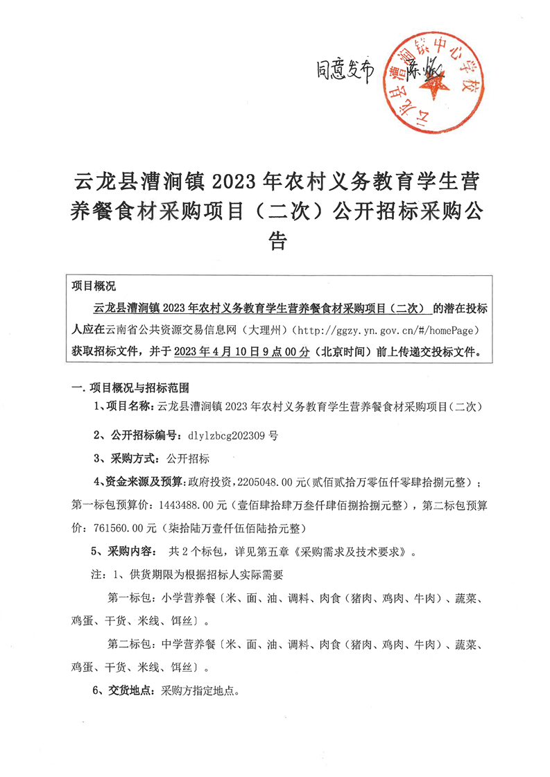 云龙县漕涧镇2023年农村义务教育学生营养餐食材采购项目(二次)采购公告