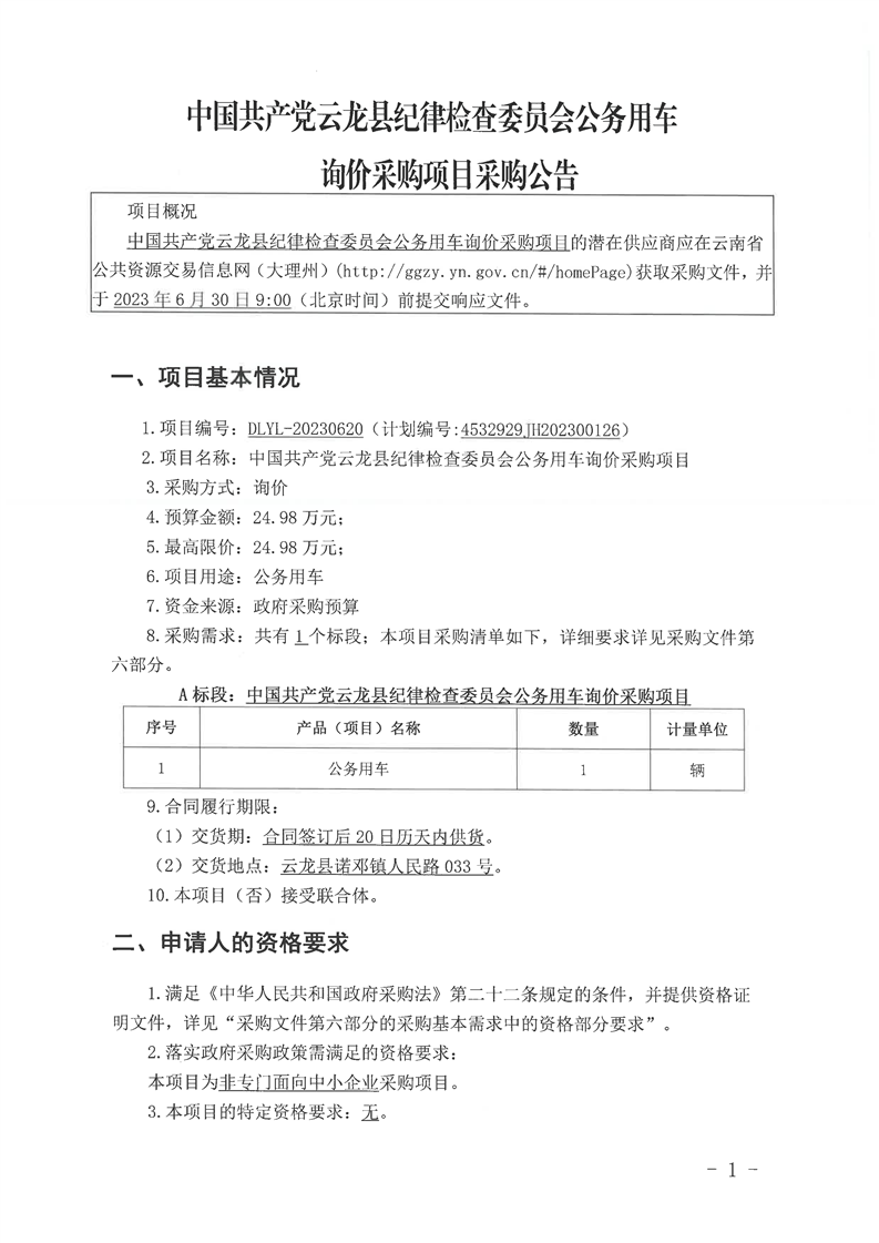 中国共产党云龙县纪律检查委员会公务用车询价采购项目招标公告