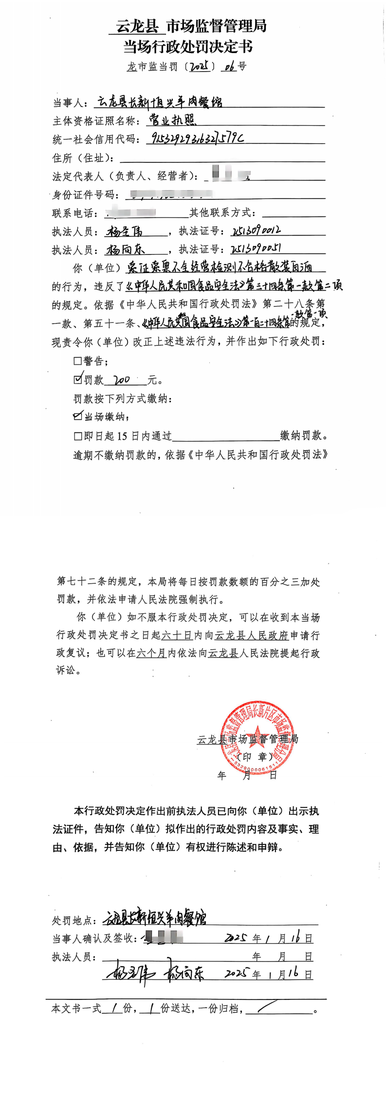 云龙县市场监督管理局当场行政处罚决定书